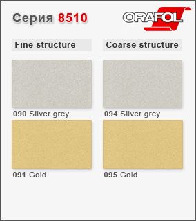 Серия представлена полупрозрачными пленками четырех тонов: серебристый (гладкая поверхность) — № 90, «золото» (гладкая поверхность) — № 91, серебристый (зернистая поверхность) — № 94, «золото» (зернистая поверхность) — № 95.