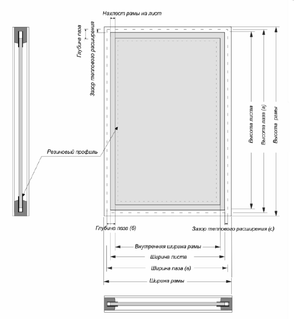 Обратите внимание: в нижней части поликарбонатного листа предусматривать зазор не нужно! Также стоит учитывать глубину паза, которую необходимо увеличивать с ростом ширины плиты. Для более широких листов необходимо выполнять более глубокие пазы.